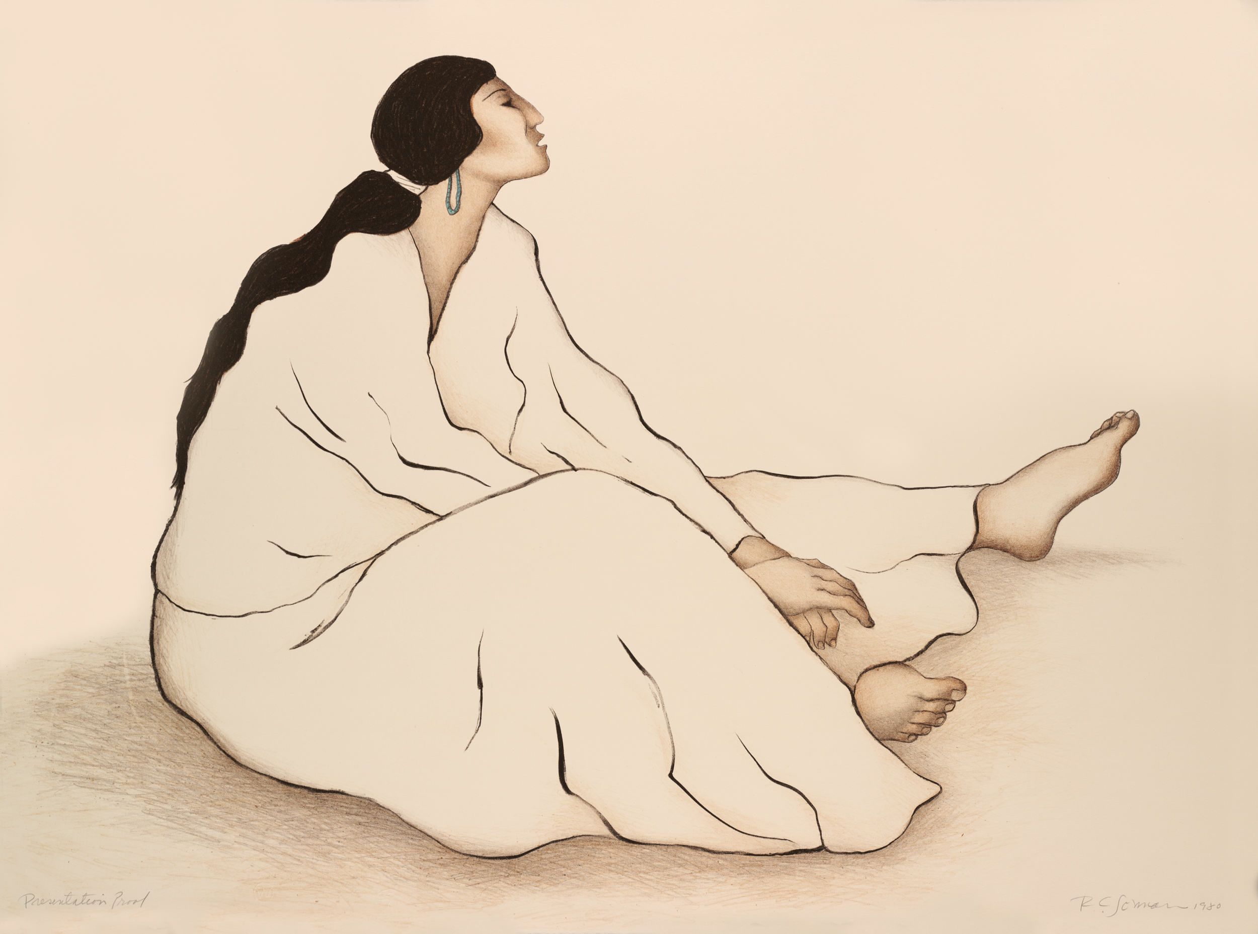 Tags: 1979, Anaba, bare feet, collectible print, cream, Gorman lithograph, graphite, late 1970s Gorman, long braid, minimalist portrait, monochromatic, muted tones, Native American art, Navajo woman, neutral palette, no landscape, R.C. Gorman, seated figure, soft background, Southwest art, taupe, turquoise earring, warm neutrals