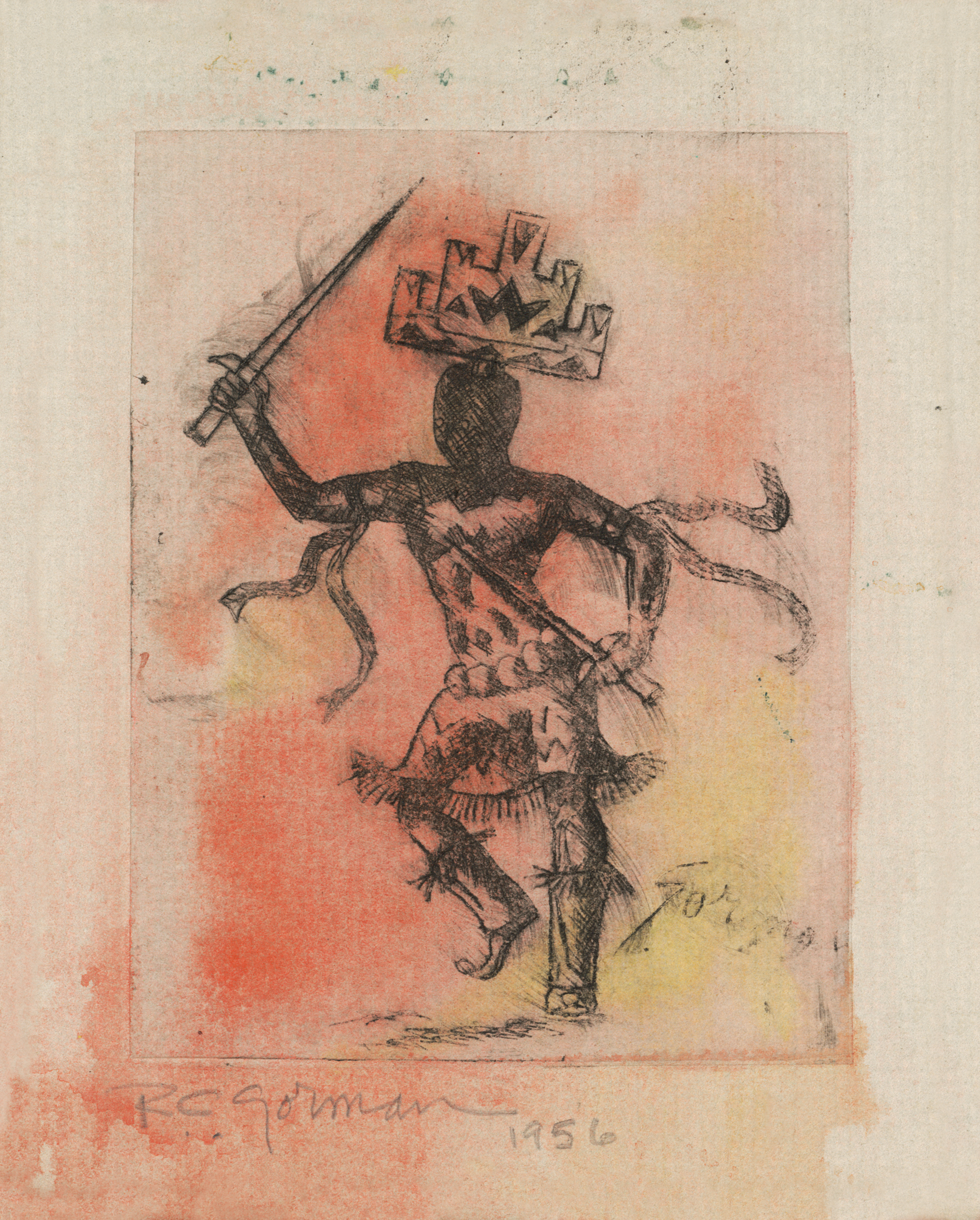 Apache Devil Dancer is a 1956 R.C. Gorman etching — one of the earliest works in his catalog and a rare window into his student-era practice. It portrays a traditional Apache Crown Dancer (Gáán), a sacred mountain-spirit figure, mid-stride with a sword-like wand raised and the distinctive stepped wooden crown headdress towering above. The etched line is loose, energetic, and expressionistic, washed over with warm red, gold, and cream plate tones. From a tiny edition of only 4 (approx. 3 x 4 in.), this intimate miniature is museum-rare and an exceptional find for serious collectors of early R.C. Gorman etchings, Apache ceremonial art, and vintage Native American fine art.