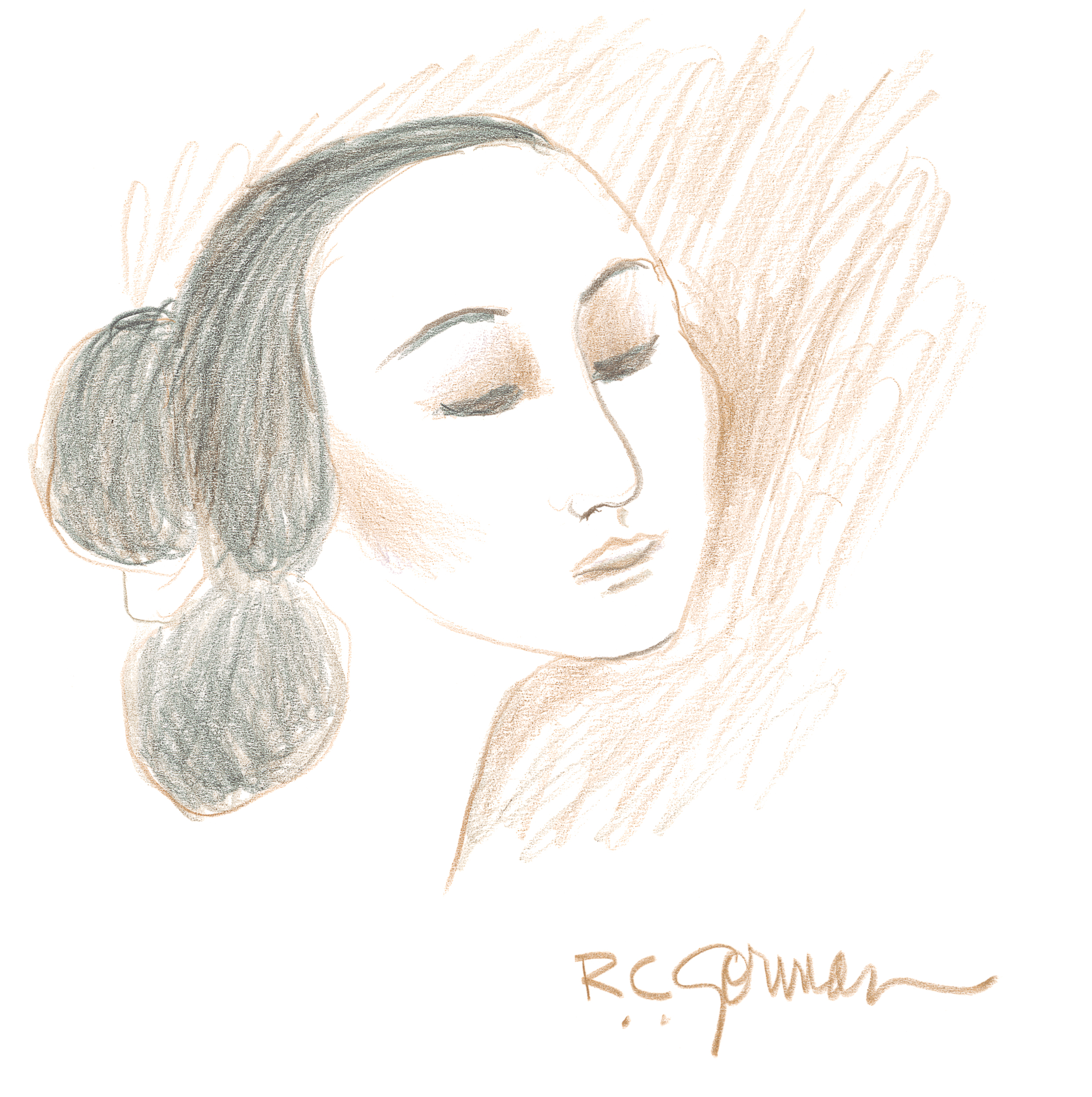 Ava is an R.C. Gorman original pastel drawing of a young Native woman in three-quarter profile, her eyes serenely closed and dark hair swept into a low chignon. The portrait is rendered in quiet graphite and sienna tones, with a halo of warm ochre pencil strokes radiating behind her head like desert sunlight. Large areas of pristine paper hold the figure in luminous space, and Gorman’s signature anchors the composition at the lower right. As a one-of-a-kind original oil pastel, Ava is a contemplative, collector-grade portrait that speaks to admirers of R.C. Gorman drawings, quiet Navajo portraits, and intimate Southwest pastel originals.