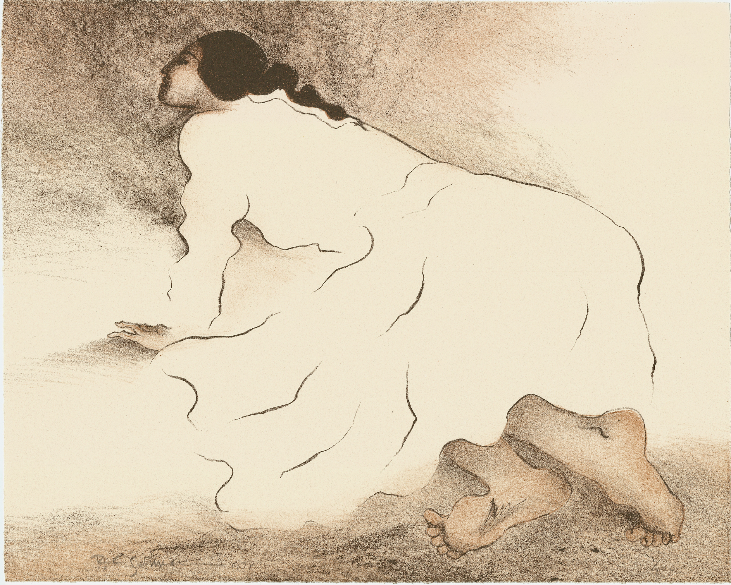 Tags: 1970s Gorman, 1978, bare feet, collector print, contemplative mood, cream background, crouching figure, fine art lithograph, gallery piece, gestural linework, Gorman lithograph, honey brown, ivory tones, limited edition print, line drawing, master draftsmanship, minimalist, Native American art, Navajo woman, no landscape, R.C. Gorman, sepia line, signed and numbered, Southwest fine art, warm palette, white dress