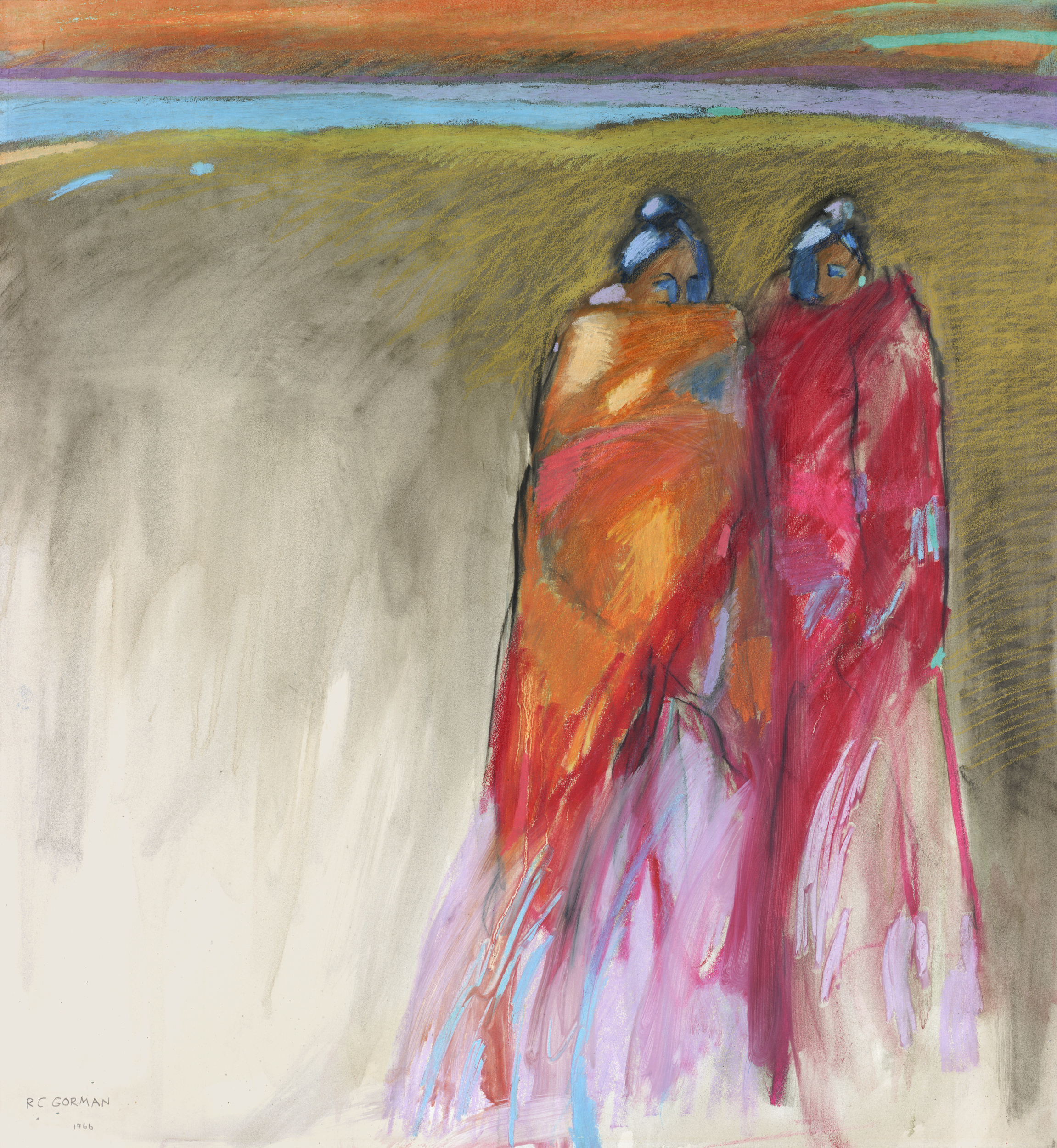 Best Friends, a 1966 R.C. Gorman oil pastel, captures two close Navajo women standing together beneath a blazing sunset horizon that bands across the top of the composition in coral, crimson, teal, and warm olive. Wrapped in fiery orange and deep rose rebozos, the pair leans slightly toward one another, their faces small ovals of blue shadow above richly painted shawls. Gorman’s loose, painterly strokes pour down into streaky pink and violet passages at their feet, dissolving the figures into the earth and giving the piece an expressionist energy. This signed 1960s original is a rare window into the artist’s early career and a standout find for collectors of vintage Gorman work, Navajo friendship imagery, and gestural Southwest fine art.
