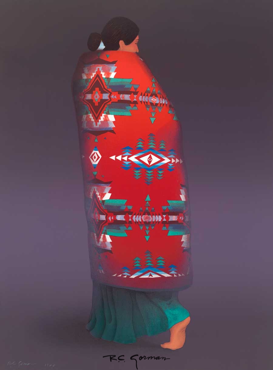 Each finished lithograph consists of several layers of carefully aligned colors and shapes that were sequentially pulled from separate stone drawings.  In his lithographs, R.C. Gorman was well-known for his use of the “Rainbow Roll,” which is the smooth gradation of color that often appears in the backgrounds of his pieces.